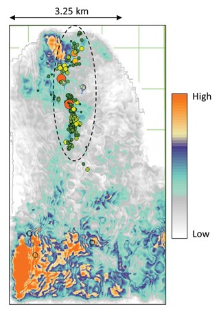 Figure 4: Horizon slice from inverse fracture toughness measure volume for the Duvernay formation in the Fox Creek area in central Alberta, Canada. Notice, the high values of inverse fracture toughness measure (or low values of fracture toughness measure) correlate well with the induced seismicity data overlaid on the display. Induced seismicity data is courtesy of Repsol Oil and Gas, Canada.