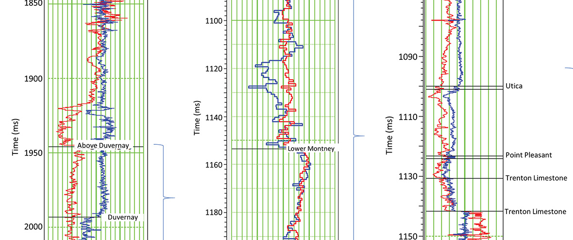This combination of high Young's modulus and low Poisson's ratio as a measure of brittleness may not be true for all shale formations, as different shale formations exhibit different characteristics based on their mineralogy. In figure 2 we show the Young's modulus and Poisson's ratio curves and their cross plots for three separate shale formations. The first one is the Duvernay Formation in the Fox Creek area in central Alberta, Canada. The second example is from the Montney Formation in British Columbia, Canada, where the Upper and Lower Montney shales are cross-plotted. Notice the Lower Montney exhibits high Young's modulus and high Poisson's ratio, whereas the Upper Montney show low to intermediate Young's modulus and low Poisson's ratio. Our third example is from Utica Shale in Ohio, and it shows low Young's modulus and low Poisson's ratio.
