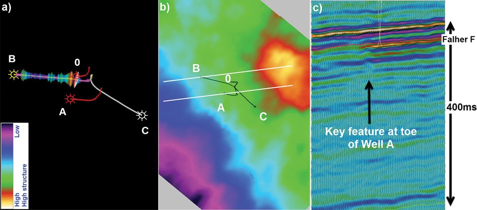 Figure 1. Maps depicting the key elements of the case study. (a) A 3-D perspective view of wells 0, A, B, and C. Well B has an image log estimateof fracture density. The fracture density is displayed as rings whose size is linearly proportional to density. Well 0 and Well A both encounterednumerous open fractures, suffered uncontrolled losses of drilling mud and were abandoned due to related operational concerns. Well C had nodiscernable operational issues, although some fracture infill material was reported by the wellsite team. (b) A time structure map of the Falher Ffor a portion of the study area. The two seismic lines to be used in the line analysis are shown as the white straight lines. (c) The southernmostof the two indicated seismic lines. The toe of Well A is indicated by an arrow, and coincides with a structural feature. All seismic data images arearbitrarily cut and rotated, with exact scales hidden, to protect the confidential nature of the data. The same color bar is used for all the images.