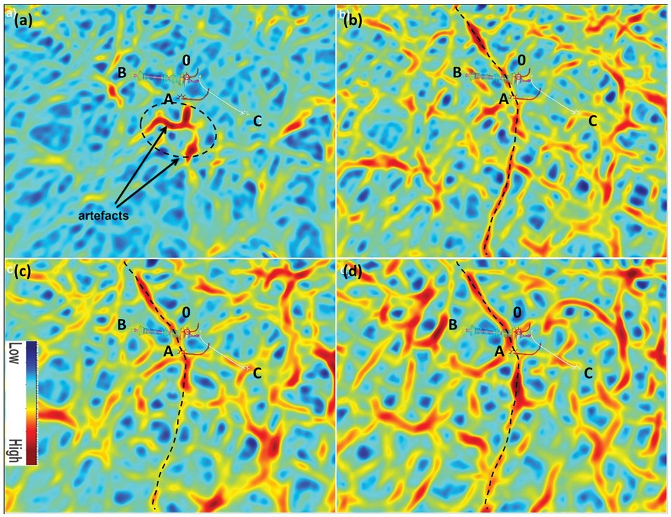 Figure 2 depicts a subset of the map comparisons. The image log fracture density as shown along the lateral of Well B along with the position of the toe of Wells 0 and Well A are important considerations in this figure, as interpretability was based on the expected arcuate or linear curvature feature connecting the toes of Well 0, Well A, and the high fracture densities from Well B. All the results, except for the horizon-based one, show the expected high most-positive curvature trend, although some details change in the complexity of the trend. The horizon based map of Figure 2a was considered poor as it was dominated by pick-based artefacts (enclosed in a circle). The main arcuate feature mentioned above is shown in black dashed curve and overlaid on the images in (b) to (d). The unfiltered 9x9x98 milliseconds volumetric result of figure 2b appears quite interpretable on map view, although smaller time (z) windows gave poor results. The Gaussian filtered volumetric result is shown in figure 2c, and is considered good. The Fourier filtered result (with a fractional index parameter alpha=0.2) is shown in figure 2d, and is considered excellent, especially in its preservation of curved features.