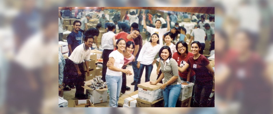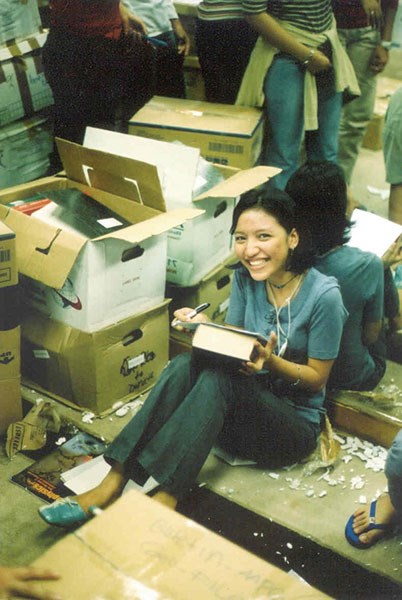 Aditya Sayilendra, former Student Chapter member now working for Landmark, assists students in sorting books at Trisakti University.
