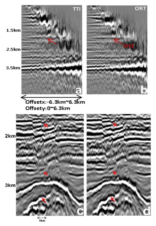 Figure 3. P-P reflection data from an ocean bottom survey, offshore Vietnam. a) An azimuth-sectored TTI common image gather after four iterations of tomographic update from water bottom to top of basement (anticline reflector at ~3-kilometer depth). Data is sorted as a “snail” gather, meaning there are a suite of offset bands within which the azimuths go from North to South. The TTI prestack depth migration has taken care of the layer anisotropy, but has left in the azimuthal traveltime wobble, see red arrow. b) Initial ORT common image gather. The ORT velocity field has specified the VTI and HTI effect sufficiently to flatten the event (red arrow). c) Azimuth-limited TTI stack section. d) Initial ORT stack section. The red arrows point to locations where the ORT prestack depth migration has improved the image. Because the azimuthal traveltimes are corrected, the stack can use all azimuths and all offsets, for superior S/N. Moreover, we now have the ORT migration velocity field to use in interpretation: a very important step. (Adapted from Jiao, et al., 2017)