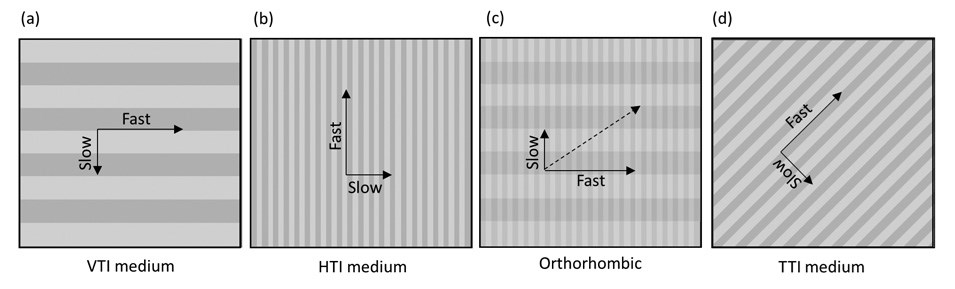 The principal order in the heterogeneities smaller than the wavelength is the layering of the rocks: we routinely expect to find a plane of isotropy in the bedding plane. If there is a plane of isotropy we have transverse isotropy (TI). Now we have to state the normal to the plane of isotropy. Transverse isotropy with a vertical axis, VTI, is the layer anisotropy (see figure 1). Transverse isotropy with a tilted axis is TTI (dipping beds). VTI or TTI means that the P wave traveling parallel to the bedding plane will have the same (faster) velocity whether it travels north or east or south, etc. However, normal to the bedding plane, the P wave velocity will be slower. Figure 2 presents schematically the symmetry terms.