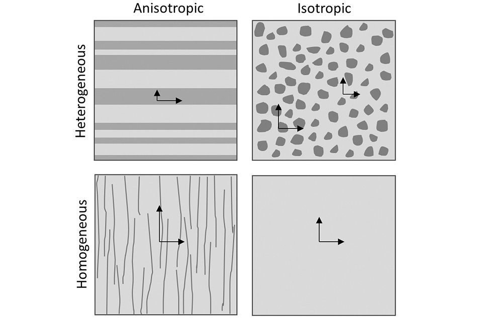 Four words provide the fundamental description of rocks: homogeneity, heterogeneity, isotropy and anisotropy.