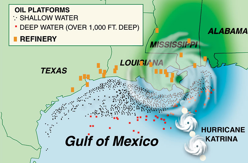 For Katrina, 561 platforms and rigs were evacuated, according to the U.S. Minerals Management Service (MMS), accounting for a quarter of U.S. oil production. Over 91 percent of daily oil production and 84 percent of natural gas production was shut-in in early September.