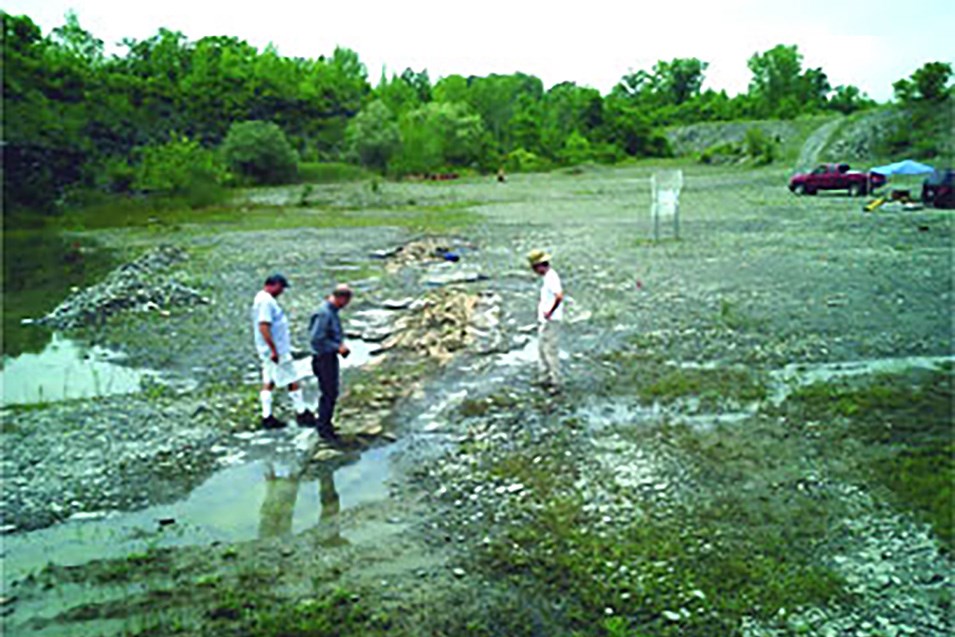 Palentine Bridge limestone quarry, Mohawk Valley, N.Y. In the foreground the excavated dolomitized en-echelon fault zone is visible; limestones are grey and the dolomites have a brown tan. The 3-D GPR survey (figure 2) is located in the background of this view, where the fault was still buried under rubble.