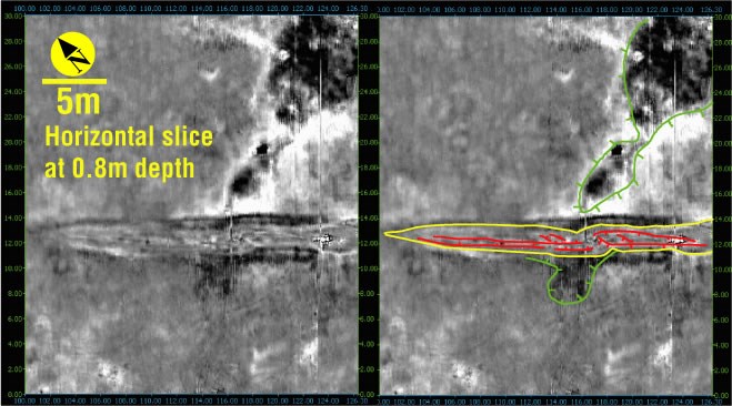 Horizontal slice through 3-D GPR survey covering an area of 26.3 m x 30 m with a survey grid of 0.05 m x 0.10 m using 250 MHz GPR antennae.