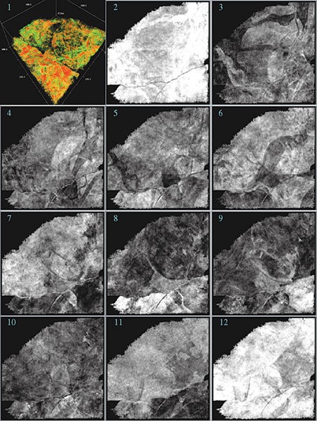 Proportional slices between two closely spaced horizons show rapid changes in depositional patterns not evident in either the volume sculpted view (1), top horizon (2) or base horizon (12). Seismic data courtesy of Seitel.