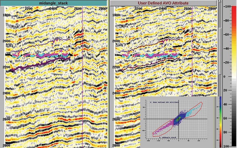 A single line near the southern end of the survey shows some of the AVO characteristics of the anomaly. The section on the left is from the mid angle stack, while the section on the right is from the full stack. Data between the two interpreted horizons was used to generate the crossplot in the lower right corner. When the anomalous crossplot amplitudes are posted back onto the sections they highlight the flat spot. This figure implies about a 120 ms hydrocarbon column height if the flat spot is a fluid contact.