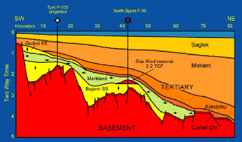 Hopedale's southernmost part, two wells tested gas from an interpreted