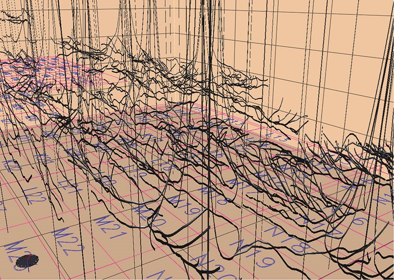 A full field 3-D view of the subsurface well bones in Venezuela's Zuata Field showing the intricate placement of 241 horizontal wells. This display also illustrates how fishbones can effectively connect many parts of the reservoir which may have been left undrained if fishbones had not been used.