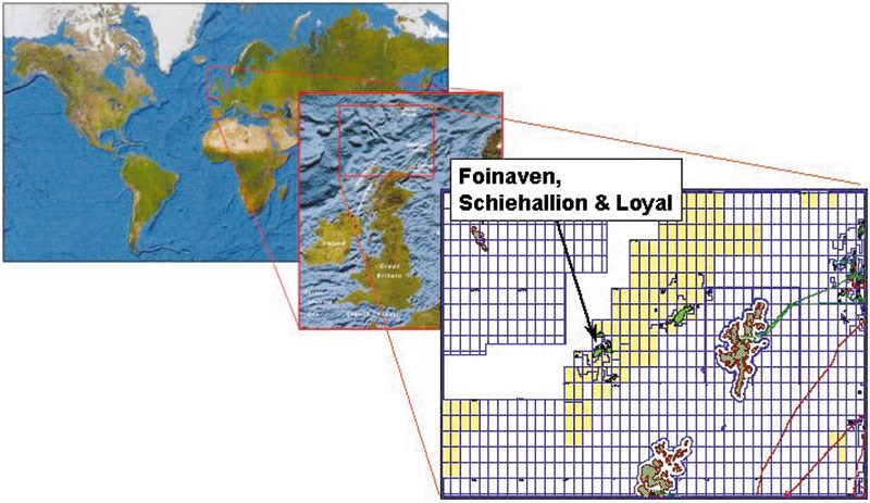 Location maps for the Foinaven, Schiehallion and Loyal fields, located about 170 miles west of the Shetland Isles, in water depths of between 350 and 550 meters.