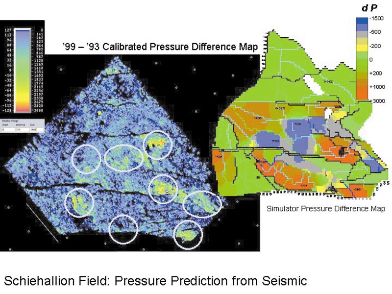 Pressure from 4-D seismic (right): Seismic attributes calibrated to pressure on the Schiehallion Field show a good correlation with predicted pressure response from the simulator output.