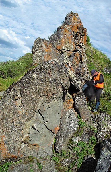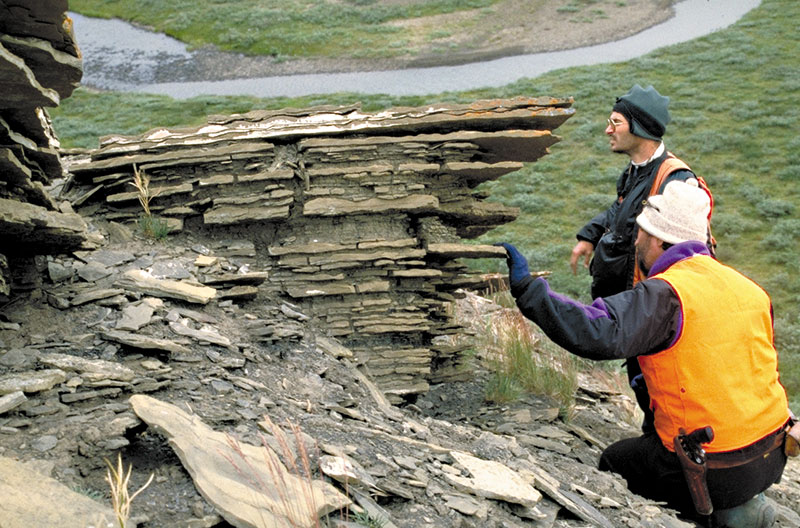 A geologist at work in Alaska examines conglomerates in Cobblestone Sandstone member of the Fortress Mountain Formation. The large tan block is a clast of sandstone in conglomerate. This site is in the Brooks Range foothills, about 80 miles southeast of Umiat.