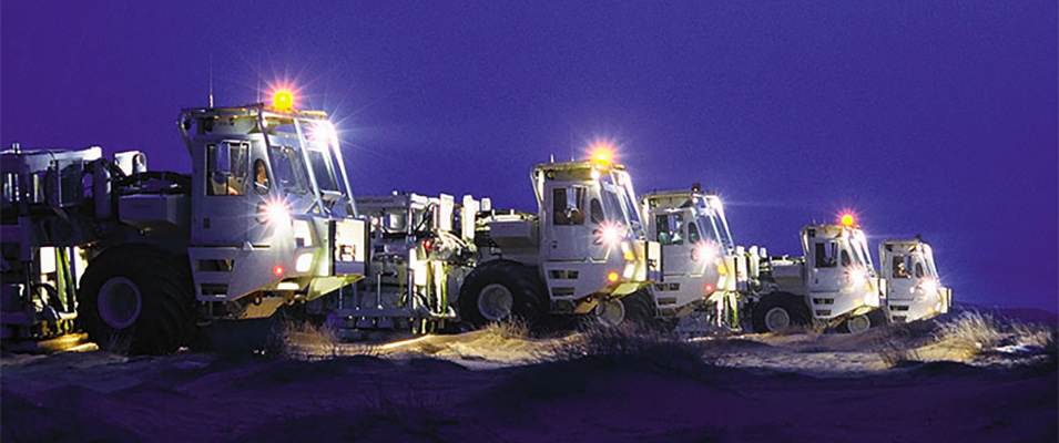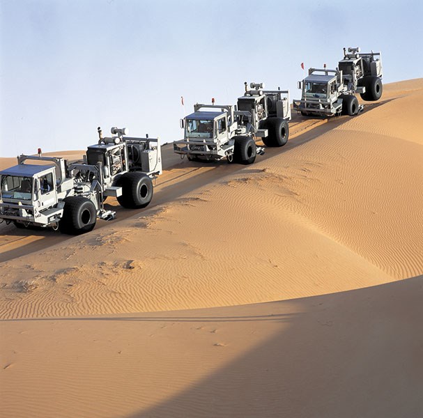 Bottoms up: A desert vibroseis crew in action in Abu Dhabi. Geophysical companies say that, despite the current industry slowdown, a lot of work remains to be done.