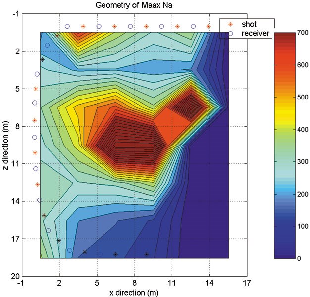 2-D seismic data over two Maya pyramids and an adjacent plaza at
