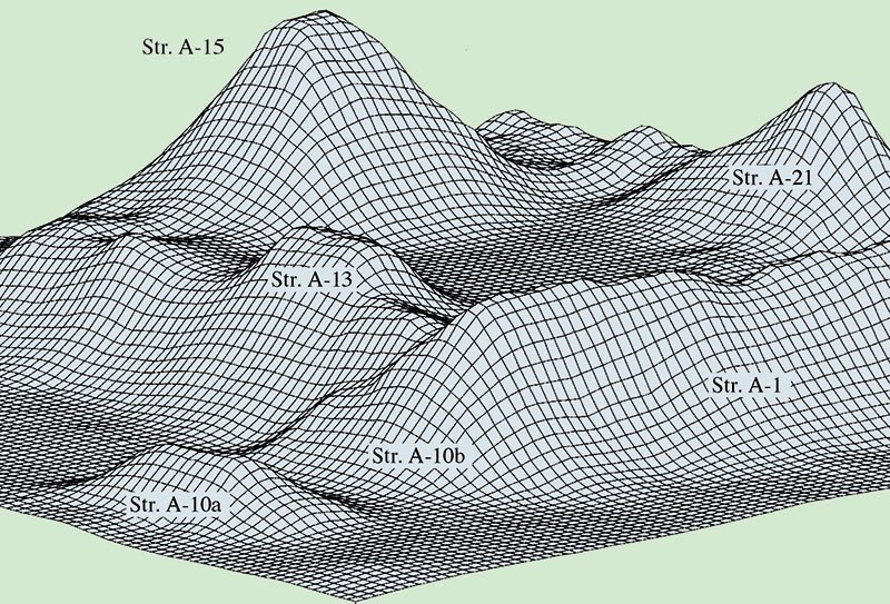 A mesh, 3-D digital elevation survey plot of the Upper Plaza, Chan Chich. (Houk, 1997)