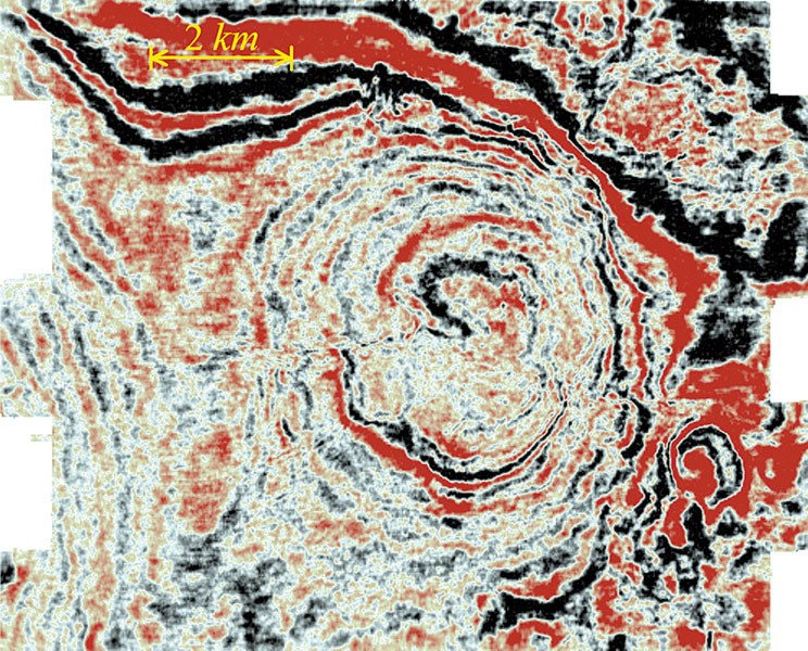 A picture of the moon? No, a time slicethrough a seismic volume displayed as shaded relief.Note the left-to right fault cutting across the dome.