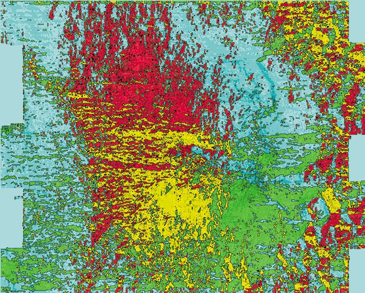 Dip-azimuth corresponding to figure 2. Thecolor represents the azimuth, which refers to the down-dipdirection and is therefore perpendicular to geologic strike.Blue is north, green is east, yellow is south, and red is west.The shading of the color represents the dip, with more shadingsignifying steeper dips. Dip-azimuth presents the sameinformation as shaded relief, but is less intuitive.