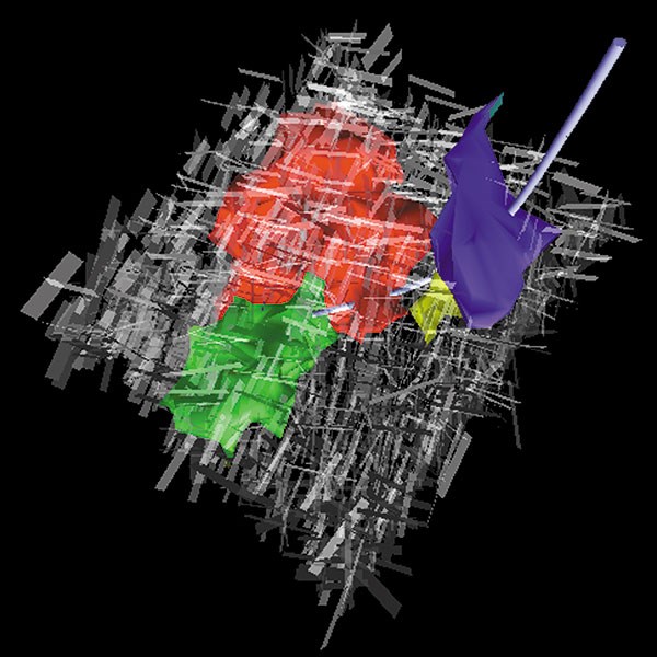Synthetic fracture model with proposed well. The model contains four fracture setsinterpreted from the laserscan data. A synthetic, deviated wellbore intersects thefracture network at the upper right side of the figure.