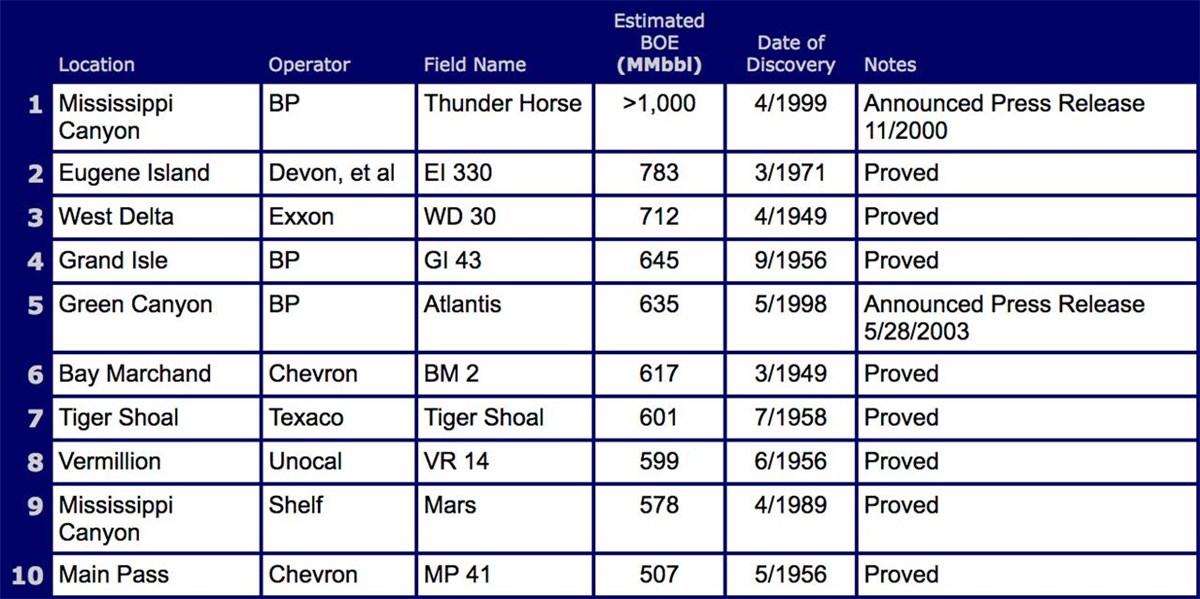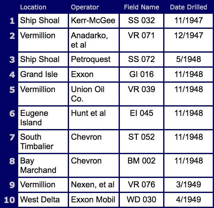 It all started in 1947, when Kerr-McGee made the first Gulf discovery at Ship Shoal 32, about 10 miles off the Louisiana coast in 18 feet of water. The firm is credited with setting the first offshore platform in the Gulf at its new field. Amazingly, that first oil field is still producing 56 years later -- and it is not alone. Many of the earliest discoveries in the Gulf are still producing today. (See GOM's Top Ten Table 1)