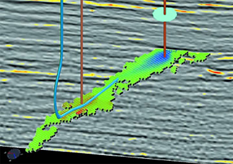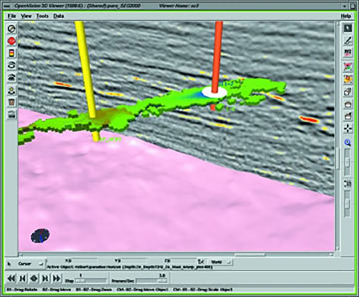 Simulation model showing fluid migration within the reservoir.Displayed with the seismic data (in depth). Simulation was doneto evaluate possible production from the well on the left with thevertical well on the right being used to inject water.
