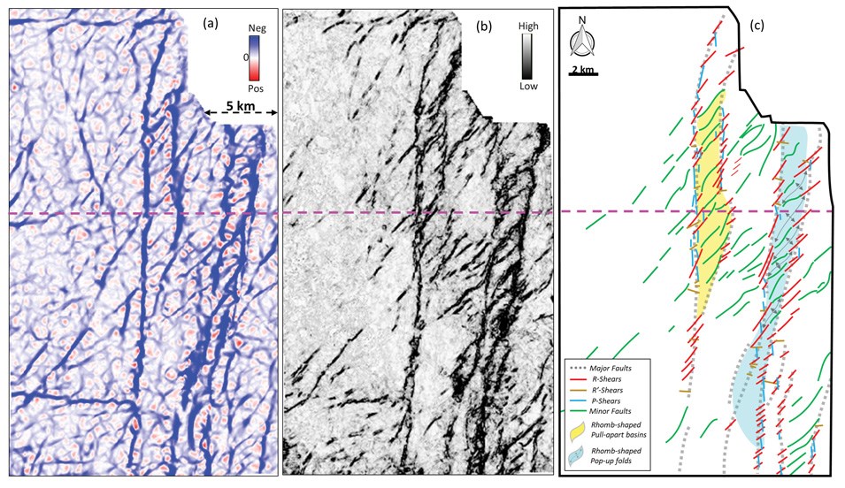 As wrench faults form because of a horizontal shear couple, which in this case is likely basement rooted, compressional and tensional forces are generated in the overlying sediments. Such forces may provide additional signatures, such as en echelon faults and fractures that could be utilized as a means of interpreting them.