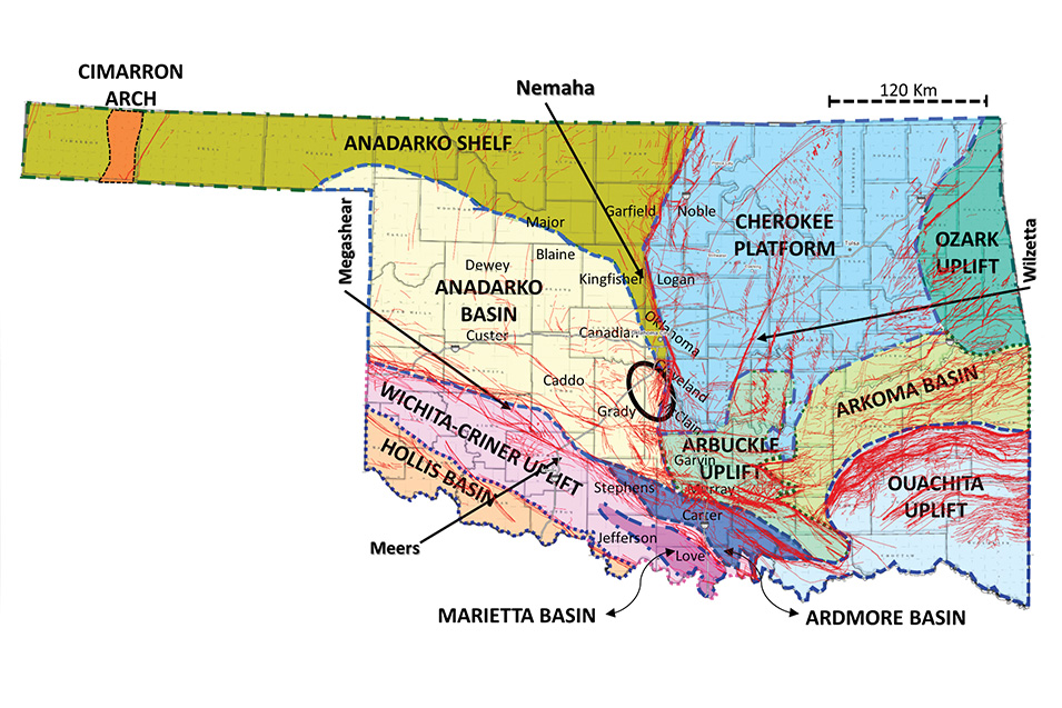 There are two thoughts on its formation, one is that it is related to the deep-rooted tip of the mid-continent rift; the other is that it could have formed due to a gentle counter-clockwise rotation of an intra-continental block lying between two bounding, left-lateral megashears, namely the Oklahoma megashear to the south (figure 1) and the Central Plains Megashear in Nebraska. It is perpendicular to the regional maximum horizontal principal stress (SHmax) orientation, which is a consistent 80-degree north/90-degree east orientation through much of Oklahoma, except in the southern part, where it deviates to approximately 50 degrees northeast. The Meers Fault is steeply dipping oblique-slip fault, which formed as part of the Wichita Uplift system. Finally, there is the Wilzetta fault, a long north-northeast trending strike-slip fault.