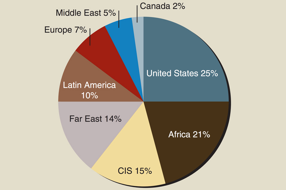 The breakdown of activity worldwide shows the heaviest concentration in the United States, which hosts 25 percent of the active crews.