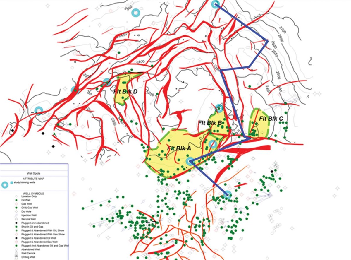 Figure 1. A well spot map of study area with all wells posted illustrating the amount of hard data available, and the four fault blocks of discussion outlined and labeled in light green. Wells used for MLP training are annotated with light blue disks, and the cross-sections in figure 3a-b are indicated by the blue traverse.