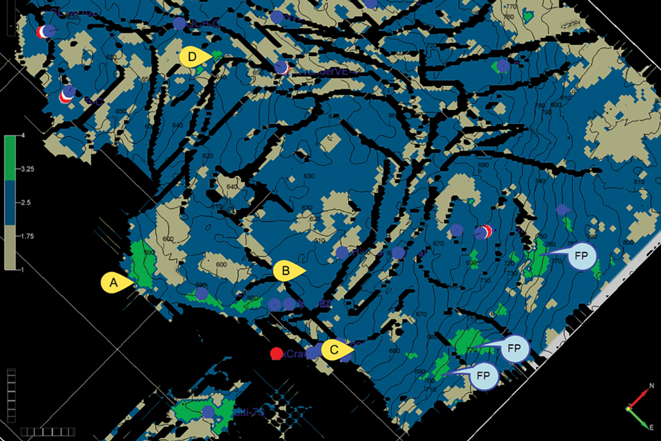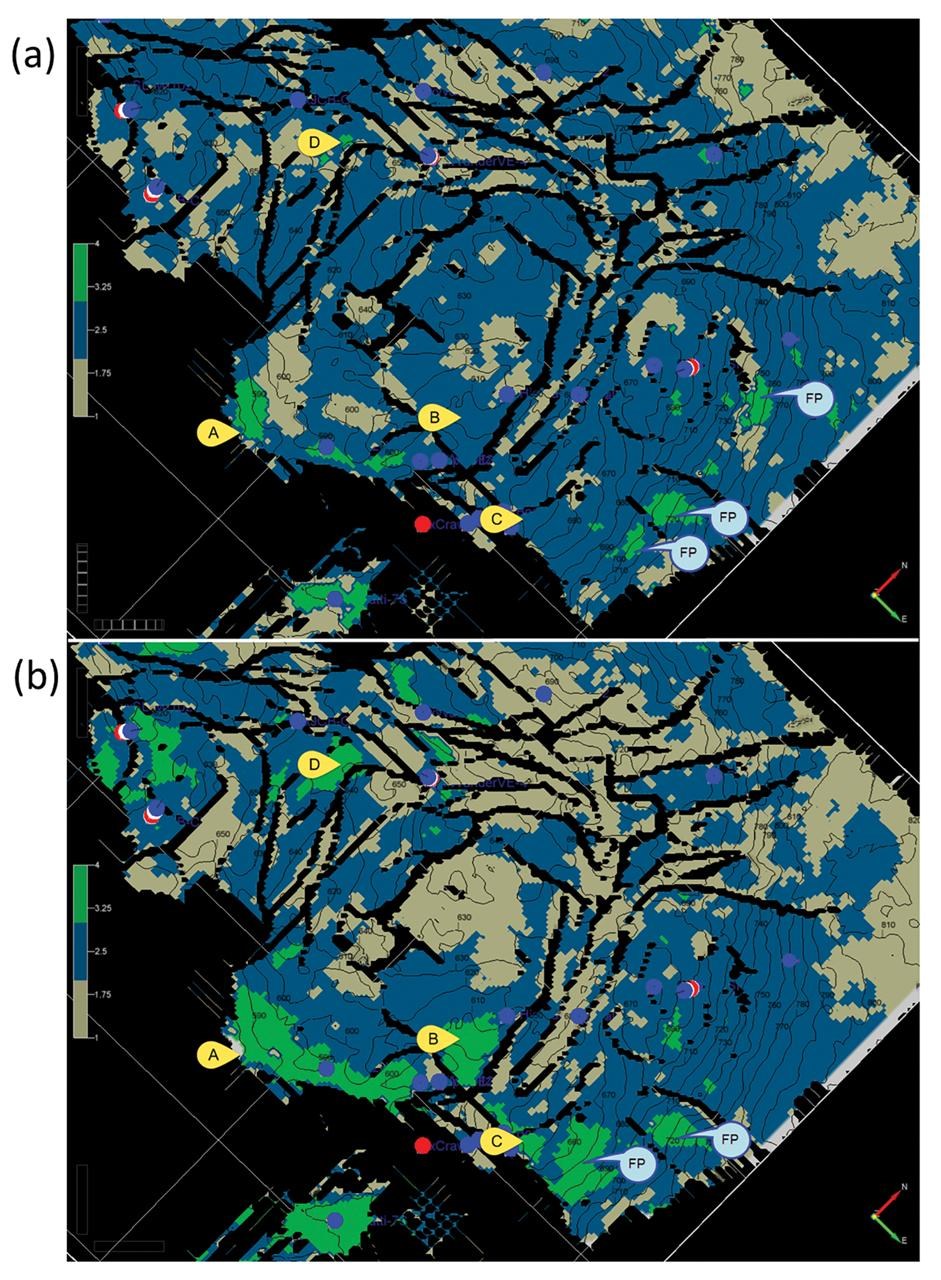 Figures 2a-b. Figure 2a (left) is the Catahoula reservoir horizon slice using the UVQ with three seismic facies. Green colors are predicted oil sands, blue colors are brine sands, and tan are shales. These classes are labeled through correlation to various wells, horizon structure and interpretive common sense (oil is trapped up-dip on the structure). Formation tops at well bores are shown by blue and red circles, labels A-D point to key fault blocks with major production, and “FPs” indicate false-positives. The oil extent is under-predicted at the crest of the structure and there are a number of false positives on the northeastern flank of the dome. Figure 2b (right) is an identical extraction from the MLP classification with three seismic facies- oil sand, brine sand and shale with the same color code as figure 2a. These classes were trained by the MLP directly through a supervised learning process. The MLP oil reservoir representation at the top of the structure agrees much better with the number of producing wells (not posted). There are also false positives with the MLP, but they are reduced in size and can potentially be identified with the relative probability volume. Furthermore, other fault blocks with smaller oil reservoirs are visible on the MLP that are not with the UVQ in figure 2a.