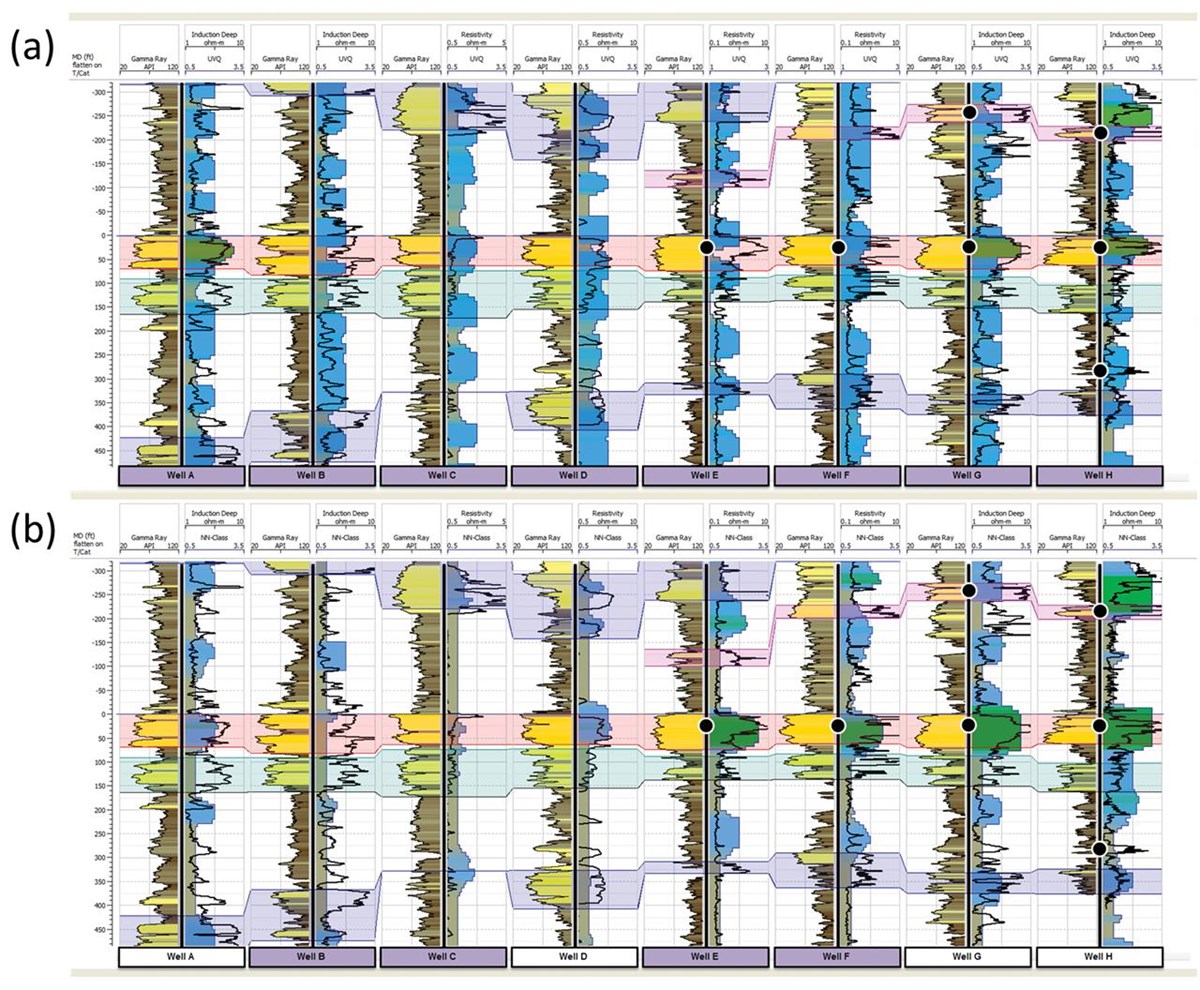 Figures 3a-b. North-south cross-sections of select wells on northeast flank of dome, flattened on the top of the Catahoula are presented. Upper Catahoula sand is shaded in red. For each well, the gamma ray log is posted in the first track with deep resistivity log posted in the second track (black curve). Cleaner sands are colored yellow while shalier intervals are in browns and tans for the gamma ray. Producing symbols (indicating the production or occurrence of oil) are posted between the two tracks, and blind wells (wells not used for MLP training) are shaded light purple at the bottom of the cross sections. In figure 3a, the UVQ seismic facies classification (variable color) is posted in track 2, with green indicating oil sand facies, blue indicating wet sand facies and shale or mudstone facies in tan. For figure 3b, the seismic facies classifications posted in track 2 are for the MLP with the same color-coding. By sampling the seismic data at these wells and posting them with observed wireline logs, one can see that the MLP cross-section better agrees with the known data than the UVQ results do.