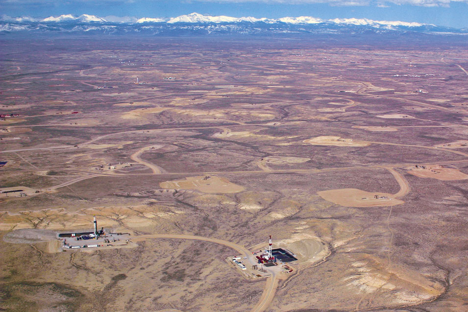 From high-altitude, windswept prairies in southwestern Wyoming, the span of the powerful Wind River and Wyoming Ranges can be seen in the distance. This is home to the Pinedale Anticline Project and the Jonah Field, located in Sublette County, Wyo.