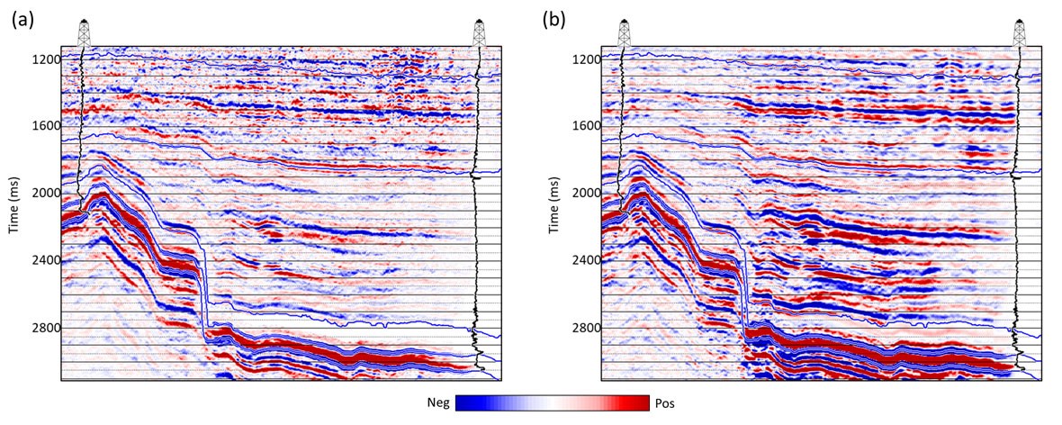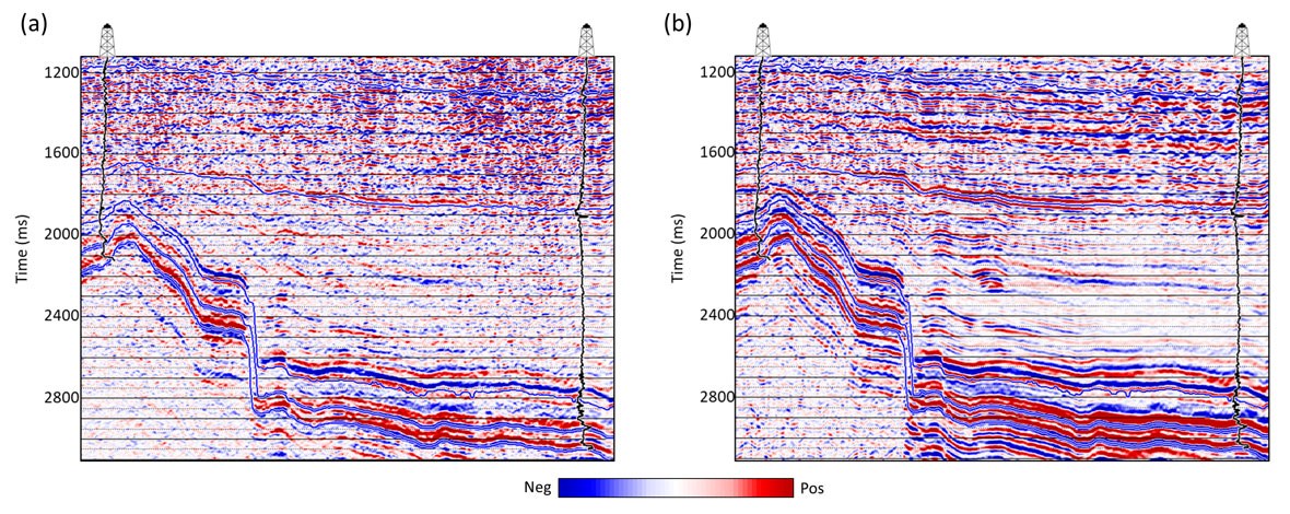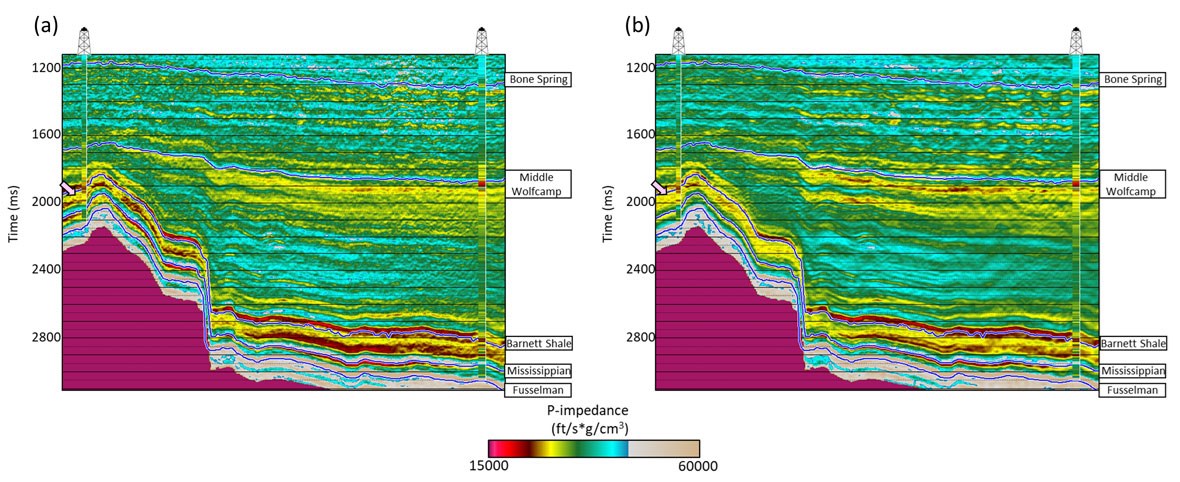 Figure 4: An arbitrary line passing though the P-impedance volume that used the (a) conventional preconditioning, and (b) preconditioning with application of some post-stack processing steps. Notice the overall enhancement in the signal-to-noise ratio and the emergence of stronger reflections through the remnant ambient noise. At the location of the pink arrow in (a) the well data does not show high impedance as seen on the seismic impedance section. A much better match is seen in (b).