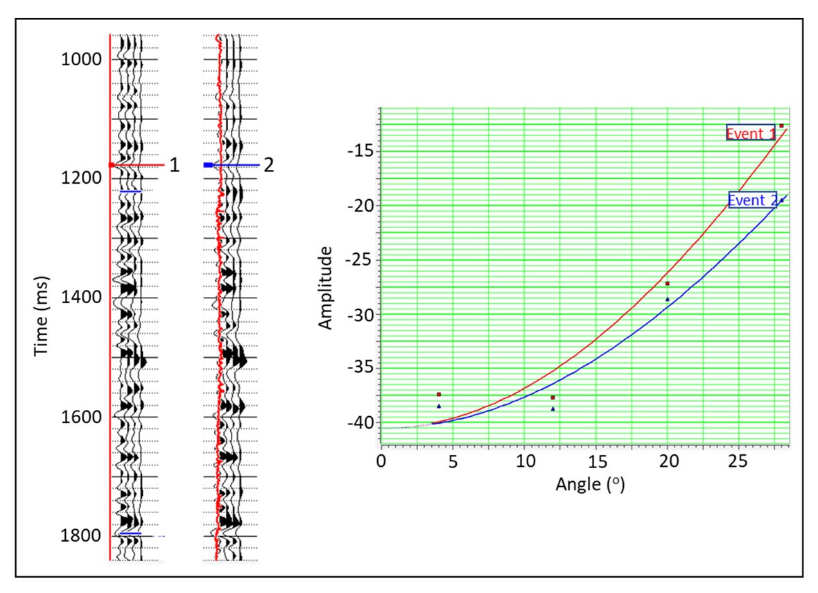 Figure 3: Gradient analysis carried out on a reflection event before (marked in red bar and indicated as 1) and after (marked in blue bar and indicated as 2) preconditioning using the post-stack processing steps. The four traces seen to the left are from the near-, mid1-, mid2- and far-stack volumes. Notice the amplitude variation trend remains the same, with less scatter of the amplitudes.