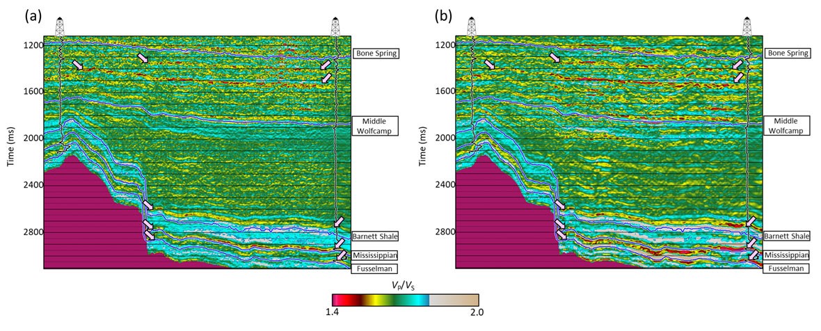 Figure 5: An arbitrary line passing though the VP/VS volume that used the (a) conventional preconditioning, and (b) preconditioning with application of some post-stack processing steps. Notice the overall enhancement in the signal-to-noise ratio and the emergence of stronger reflections through the remnant ambient noise, as indicated by the pink arrows.