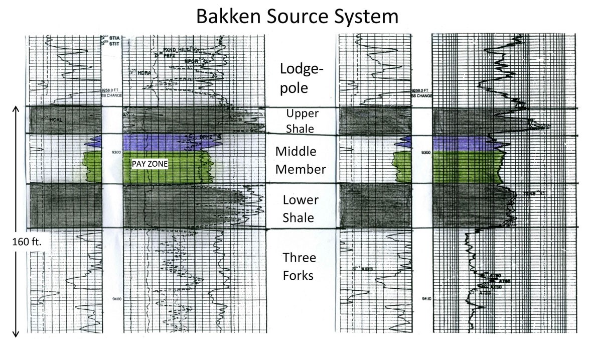 - Rich source rocks and poor quality reservoir rocks. It is a closed system 160-feet thick and extends from the top of the Upper Bakken shale to 70 feet into the Three Forks formation.