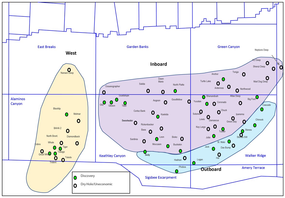 Today this Wilcox deepwater play has the largest ultimate technically recoverable resources of any reservoir in U.S. Federal waters at 22.6 BBOE (from 26 discoveries, according to 2014 data from the Bureau of Ocean Energy Management). It extends into Mexico, as documented with recent discoveries at Trion and other Pemex wells. Industry exploration, led by Chevron, Shell and other companies, and evolving scientific thinking on the source terranes, fluvial to deepwater depositional systems, chronostratigraphy, geochemistry, and paleoclimate indicate that a catastrophic drawdown of the basin water level did not occur. Rather, consideration of natural processes of source to sink sediment routing and basin depositional history can fully explain the remarkable distribution, quality and continuity of this unique sandstone-prone interval in the deep basin.