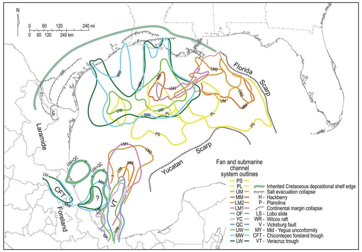 Figure 2. Compiled distribution of Cenozoic (1) collapsed continental margins, (2) submarine channel complexes, and (3) abyssal plain fan systems in the Gulf of Mexico. From Snedden and Galloway’s 2019 book on the Gulf of Mexico.