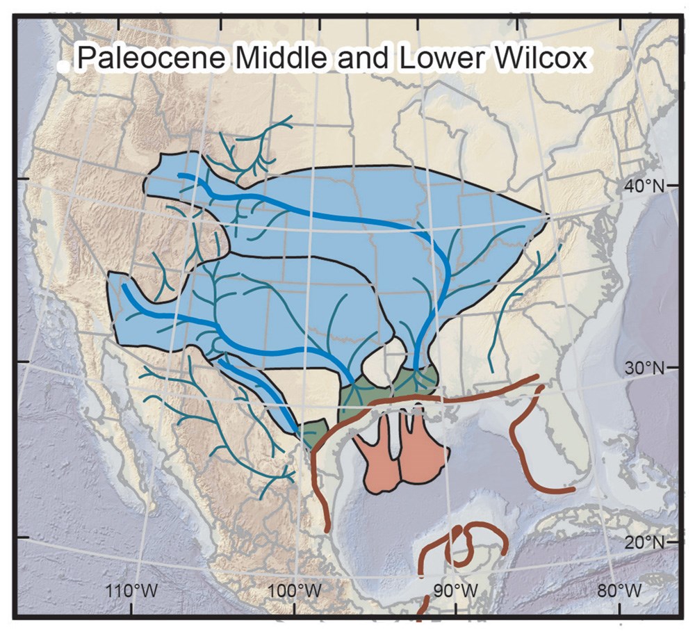 William Galloway, a senior scientist and emeritus faculty member at UT-Austin, has long worked on the Wilcox as part of the Gulf Basin Depositional Synthesis research project. In 2011, he extended his mapping of the Wilcox northward to the Rocky Mountain source terranes and defined the drainage catchments that supplied sediment to the basin during the peak of the Laramide orogeny. His peer-reviewed papers demonstrate the massive influx of siliciclastics during Wilcox time can clearly be linked to hinterland tectonic events. Subsequent papers by others (Mike Blum, Glenn Sharman and others) have confirmed this source to sink sediment routing using advanced provenance techniques such as detrital zircon geochronology. In 2018, we published a paper refining these drainage catchment maps (figure 4), but also demonstrating that the globally-based empirical scaling relationships between drainage basin size and submarine fan run out length and width are valid for the Paleogene of the northern Gulf of Mexico. In other words, big (and long) rivers often produce big submarine fans, and this is true for the Paleogene Wilcox.