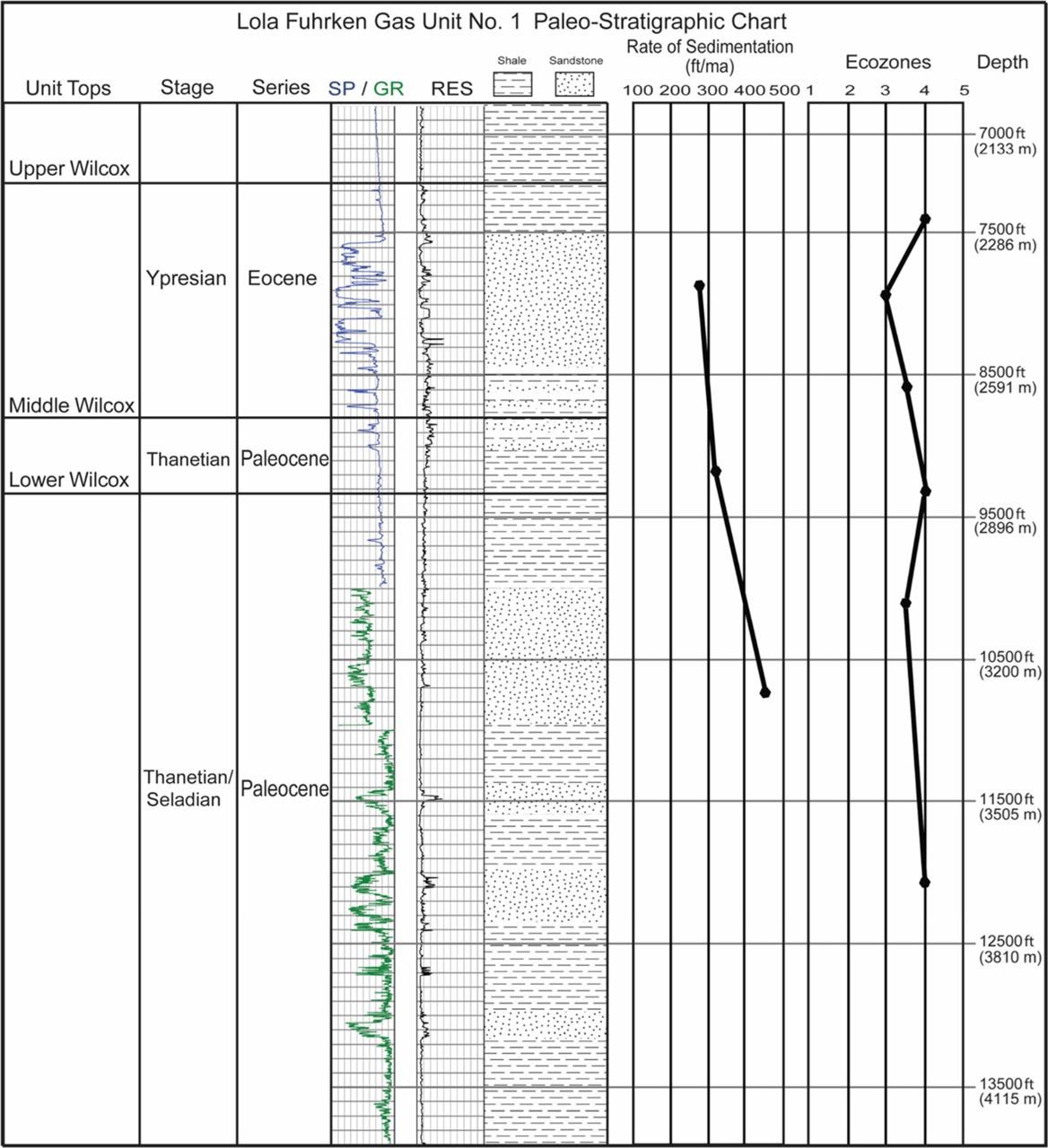 Figure 6. Stratigraphic subdivisions, paleoecology, and sedimentations rates for the Lola Fuhrken well. Rates of sedimentation are observed to be near or over 300 feet/my (91 m/my) throughout Wilcox Formation deposition slightly decreasing upward. Paleo-bathymetric ecozones were defined for different intervals by the presence of specific microfaunal taxa in the core of the well utilizing the BOEM marine environment classification. Throughout Wilcox Formation deposition, we find that this well was between the outer shelf and upper slope (330–1640 ft [100–500 m]) paleowater depths. From White et al (2019)’s GCAGS journal paper.