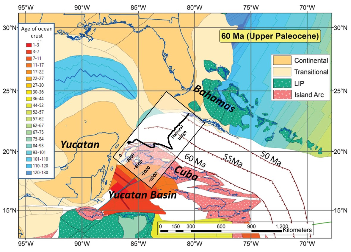 Figure 7. Plate restoration of the eastern GOM, Atlantic, and Caribbean for 60 Ma.Oceanic crust is colored by age relative to the map, with red shades the youngest. Other crust is colored according to whether it is continental, transitional, island arc or LIP (Large Igneous Province). White space is crust that gets removed by subduction or compression in times younger than the map. The position of the subduction zone north of Cuba is shown for 55 and 50 Ma.