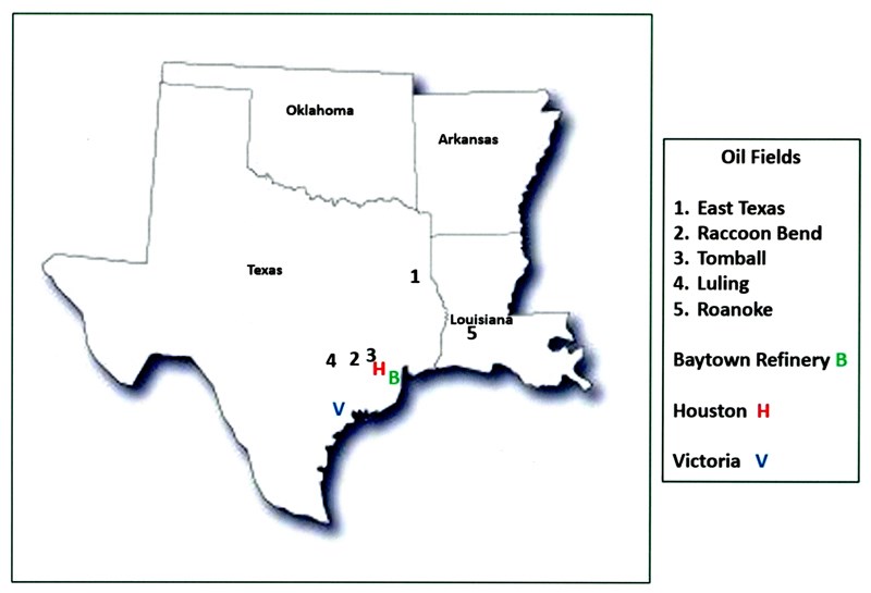 The Raccoon Bend oil field is located approximately 60 miles northwest of Houston. Harry Pennington, an independent oil operator from San Antonio, believed the area had the signs of an underlying oil field. In 1925 and early ‘26, he put together a large lease block. Realizing he needed a financial partner to cover his estimated $7.5 million of required capital, he approached H. T. (Henry) Staiti, the president of Valley Oil Corporation. Staiti had brought in wells at Humble, Damon Mound, West Columbia, Pierce Junction and other Texas Gulf Coast oilfields. Staiti agreed to help fund the project for an interest in the wells and Pennington assigned the leases to Valley Oil. Staiti contacted Humble Oil and Refining Company, which sent geologist Frith Owen to evaluate the property. Owen liked what he saw and recommended that Humble Oil join the partnership. Humble purchased a half interest in the leases on June 7, 1926 and the company acquired full control of the field on May 21, 1927.