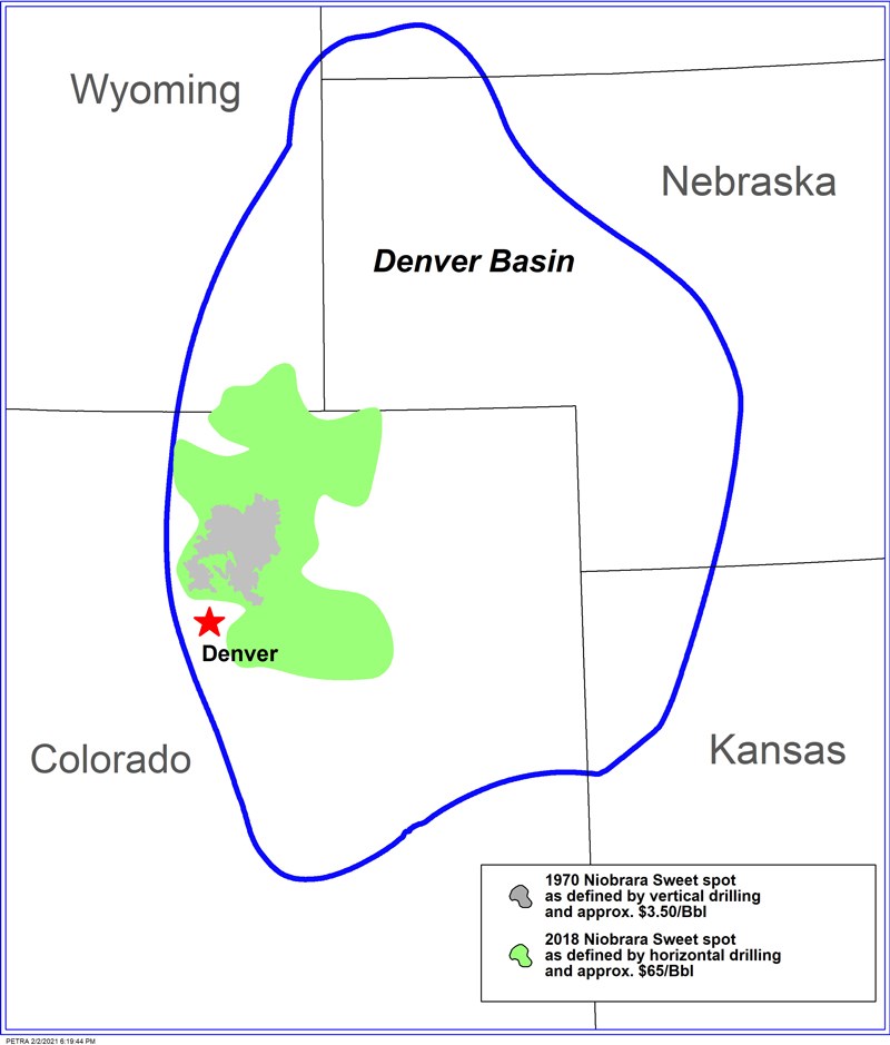 An example of this dynamic nature of the sweet spot is shown in figure 3 with the outline of the main productive area of the Niobrara Formation in the DJ Basin of Colorado taken in two snapshots. The first is from 1970 when the only technology was vertical completions and during a period of relatively low oil price. The second is from 2018 at the height of the period of horizontal drilling with long laterals and relatively high oil prices. During that nearly 50-year period, the geologic understanding greatly increased, although there was no substantial change in the subsurface conditions. Changes in technology, operations, regulations and the fiscal environment allowed expansion of the “sweet spot.” Future restrictions based on environmental regulations may in turn lead to smaller area in the future.