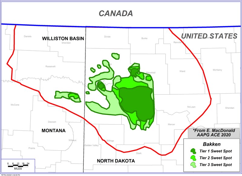 Another example of the dynamic nature of sweet spots can demonstrated by an examination of two studies of the Middle Bakken Formation in the U.S. portion of the Williston Basin. In the first study, we evaluated all horizontal wells drilled in the Middle Bakken Formation in 2015 and calculated the cumulative oil recovery, normalized for lateral length. We chose 2015 as an index year, as it was far enough past the first commercial horizontal oil production that operators had sufficient data to understand key productivity trends. The year also saw an average drop in oil prices from around $96 per barrel to about $50 per barrel, which would concentrate drilling in the highest-grade acreage. The second study came from a presentation from E. MacDonald presented at the 2020 AAPG Annual Convention and Exhibition, which evaluated every Middle Bakken well drilled for both reservoir factors (rock, organic and mechanical) and for completion style (proppants, lateral length, and amount of fluid, among other factors) to calculate a three-tiered sweet spot (see figure 5).