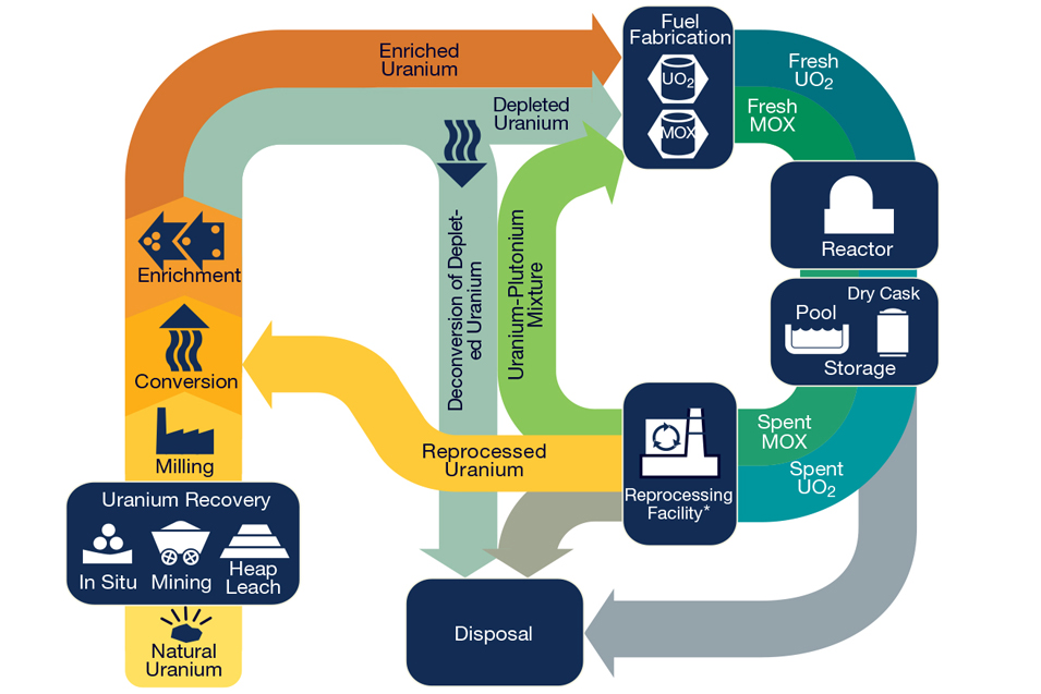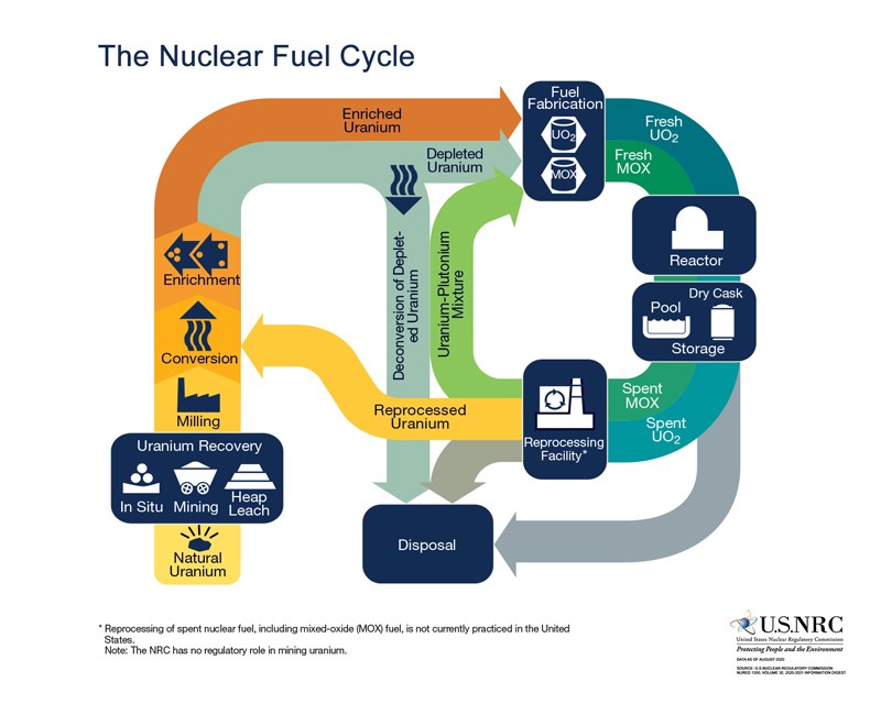 Reprocessing of spent nuclear fuel, including mixed-oxide (MOX) fuel, is not currently practiced in the United States. Note: The NRC has no regulatory role in mining uranium.