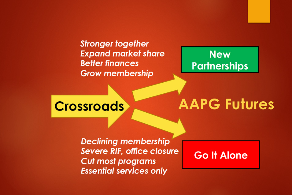In this process it is very important to understand that AAPG is at a crossroads (see diagram). In our opinion, this merger is the best option. We can merge into a NewOrg and become stronger for the future, or we can quickly fade away at the next crisis. We sincerely believe that this is a great opportunity for AAPG members now, and it is a great way to pay-it-forward for future generations of geoscientists and engineers.