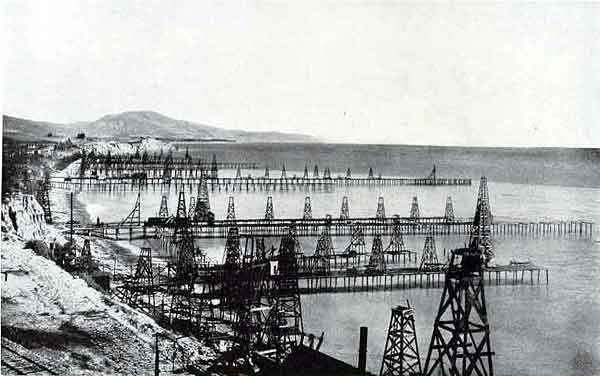 Wells on piers in the Santa Barbara Channel, circa 1901. Photo by G. H. Eldridge; courtesy the National Oceanic andAtmospheric Administration.