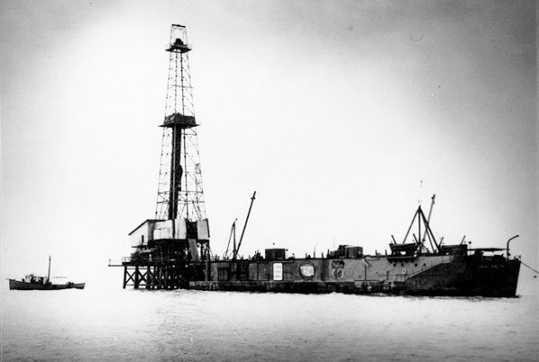 Kermac No. 16, the first platform in the Gulf of Mexico beyond the sight of land. Photo courtesy the New OrleansTimes-Picayune.