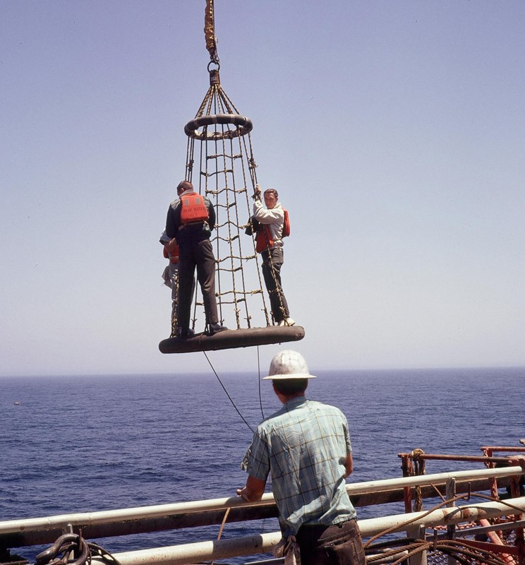 The author, right, being lifted from a boat onto the deck of a drilling platform in the Santa Barbara Channel, 1971.